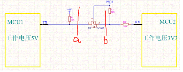 看圖3,如果沿著a、b兩條線,將電路切斷。那么MCU1的TX引腳被上拉為5V,MCU2的RX引腳也被上拉為3.3V。2N7002的S、D引腳(對應圖3中的2、3引腳)截止就相當于a、b兩條線,將電路切斷。也就是說,此電路在2N7002截止的時候是可以做到,給兩個MCU引腳輸送對應的工作電壓。
