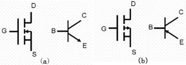 1、 場效應管的源極S、柵極G、漏極D分別對應于三極管的發射極e、基極b、集電極c,它們的作用相似,圖5(a)所示是N溝道MOS管和NPN型晶體三極管引腳,(b)所示是P溝道MOS管和PNP型晶體三極管引腳對應圖。