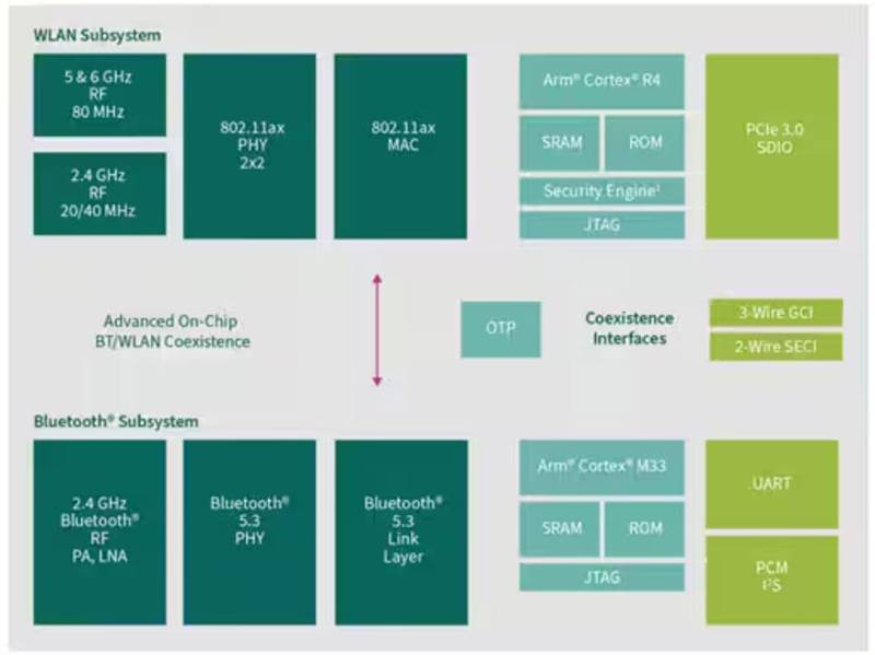 類似的 CYW55573 系列產品可提供 Wi-Fi 6/6E 三頻 Wi-Fi 連接(2.4 GHz、5 GHz 和 6 GHz),使其與 CYW55572 有所不同。