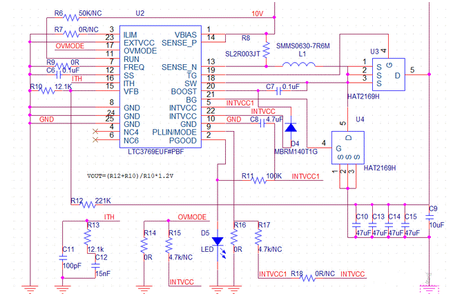 本文介紹的電路圖是輸入直流5V到10V,輸出24V@5A。工作頻率350KHz(FREQ引腳接地)。工作模式Burst Mode(PLLIN/MODE引腳接地)。如圖1