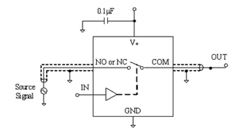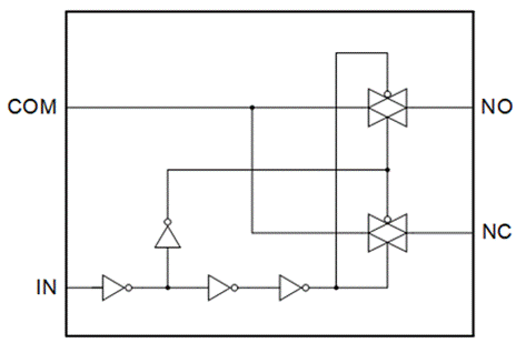模擬開關工作原理如圖1,當IN端輸入低時,通過邏輯控制使得COM和NC之間的通道閉合,COM和NO之間的通道斷開,IN端為高時,則與之相反。