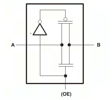 圖2為NO/NC口的FET(傳輸門)的原理圖,由一個N溝道晶體管和一個并聯的P溝道晶體管組成,當OE端輸入為高時,經過反相器后,P溝道導通,N溝道導通,此時A到B導通。與之相反,當OE端輸出為低時,P溝道與N溝道阻斷,此時A到B關斷。