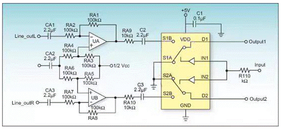 修正以上兩個錯誤后,該音頻應用電路便可以正常工作了。由以上實例可以看出,充分理解模擬開關的基本概念是正確應用模擬開關的基礎。