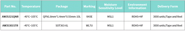 AW35321QNR采用綠色環保的小體積QFN 1.8mm * 1.4mm * 0.55mm – 10L封裝。0.5Ω(典型值)超低導通電阻以及只需要單電源供電即可支持負擺幅信號的特性使其非常適合應用于音頻領域該封裝占板面積小,非常適用于手機、PAD、超薄本等內部空間緊湊的電子設備。