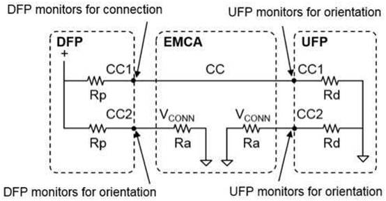 規(guī)范描述了 Type-C 上行端口 (UFP) 如何在配置通道引腳 CC1 和 CC2 上應用下拉電阻 (R d ) 以表示它是一個設備, Type- C 下游端口 (DFP) 需要在 CC1 和 CC2 上具有上拉電阻 (R p )。生成的電阻分壓器用于確定 Type-C 設備的連接和分離。每個插座中 Type-C 電纜插頭的方向很容易確定,因為電纜上只有兩個 CC 引腳中的一個連接。