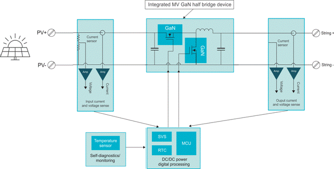 太陽能主要通過太陽能電池板的兩種子系統得以實現:一種是升壓級后跟逆變器級,將直流電壓范圍轉換為交流電壓(如圖 1 所示);另一種是降壓和升壓級,其中電源優化器將不斷變化的直流電壓轉換為常見的直流電壓電平(利用最大功率點跟蹤),以輸送到串式逆變器(如圖 2 所示)。