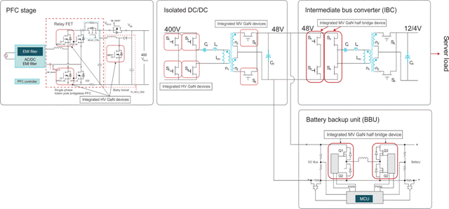 如圖 3 所示,服務器電源應用中的三個主要系統可以采用 100V 至 200V 的 GaN: