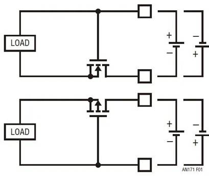 處理電源電壓反轉有幾種眾所周知的方法。最明顯的方法是在電源和負載之間連接一個二極管,但是由于二極管正向電壓的原因,這種做法會產生額外的功耗。雖然該方法很簡潔,但是二極管在便攜式或備份應用中是不起作用的,因為電池在充電時必須吸收電流,而在不充電時則須供應電流。另一種方法是使用圖 1 所示的 MOSFET 電路之一。