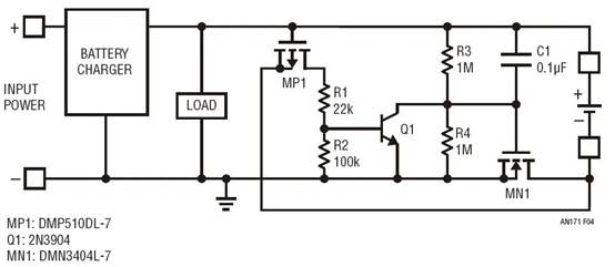 另一方面,如果充電器在電池附聯之前啟用,則 MP1 的柵極只需簡單地跟隨電池充電器輸出,因為它是由泄放電阻器 R2 上拉的。未接入電池時,MP1 根本沒有接通和使 MP2 脫離運行狀態的傾向。