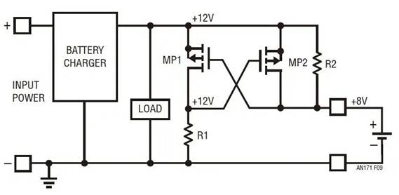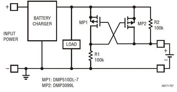 盡管比 NMOS 方法簡單,但是該電路還有一個很大的缺點。雖然它始終提供針對反向電壓的保護作用,但是它可能不會總是將電路連接到電池。當柵極如圖所示交叉耦合時,該電路形成了一個閉鎖存儲元件,此元件有可能選擇錯誤的狀態。雖然難以實現,但存在這樣一種情況:充電器正在產生電壓 (比如 12V),在一個較低的電壓 (比如 8V) 附聯電池,電路斷開連接。