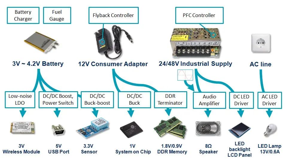 各應用基于其特殊的需求,會選擇不同電源轉換元件。下圖顯示數個應用實例和其典型常用的電源轉換元件;