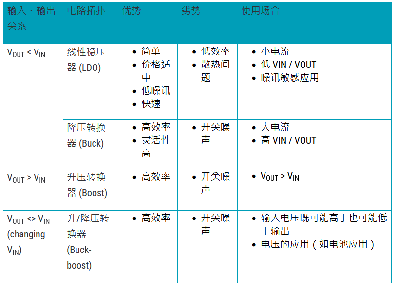 表1. 選擇低壓差穩壓器、 降壓、升壓、升-降壓轉換器的基本標準
