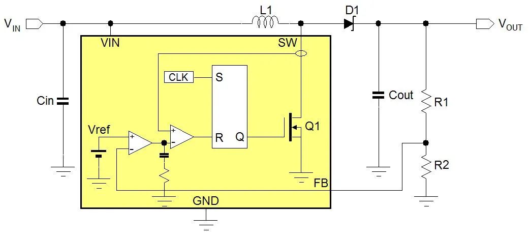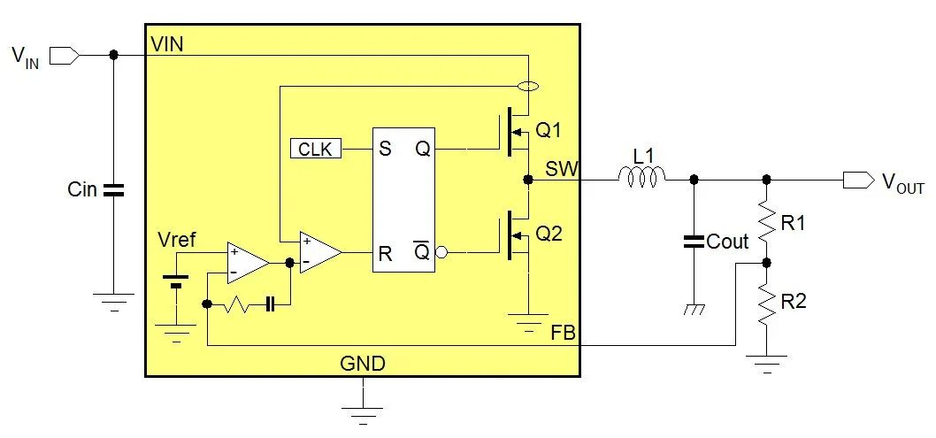 由于兩個 MOSFET 是交替開關 (ON 或 OFF),所以功率消耗非常小;藉由控制占空比,可以產生較大 VIN / VOUT 比的輸出。內部 MOSFET 的導通電阻 RDS(ON) 決定了降壓轉換器的電流處理能力,而 MOSFET 的額定電壓決定最大輸入電壓。開關切換頻率與外部 LC 濾波器元件則共同決定輸出端的紋波電壓大小;較高開關切換頻率之降壓轉換器所用之濾波元件可較小,但開關切換造成的功耗則會增加。具脈沖跳躍模式 (PSM) 的降壓轉換器會在輕載時降低其開關切換頻率,從而提高輕載時的效率,此特性對需低功耗待機模式之應用是非常重要的。