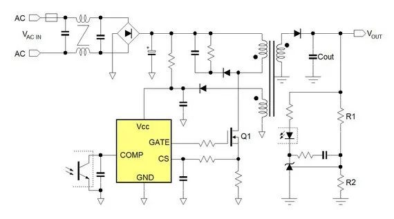 AC / DC 反激式控制器用于需將 AC 線電壓轉為一個穩定、隔離的電源電壓之應用。圖 10 所示為一個基本的反激式電源。