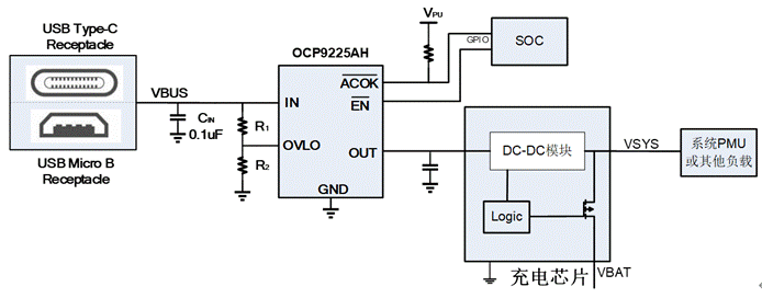 OCP9225AH還具有一個默認版本,將R1空貼,R2改為0歐姆,即可使用默認OVP功能。OCP9225AH默認OVP為6.8V,使用默認OVP,可減少外圍器件,達到減小成本的目的。