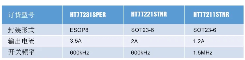 ・3.5A (HT77231) /2A (HT77221) /1.2A (HT77211) 降壓,內置100mΩ和60mΩ功率管