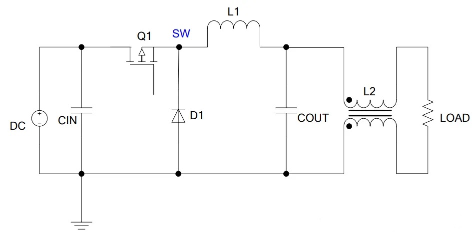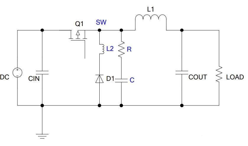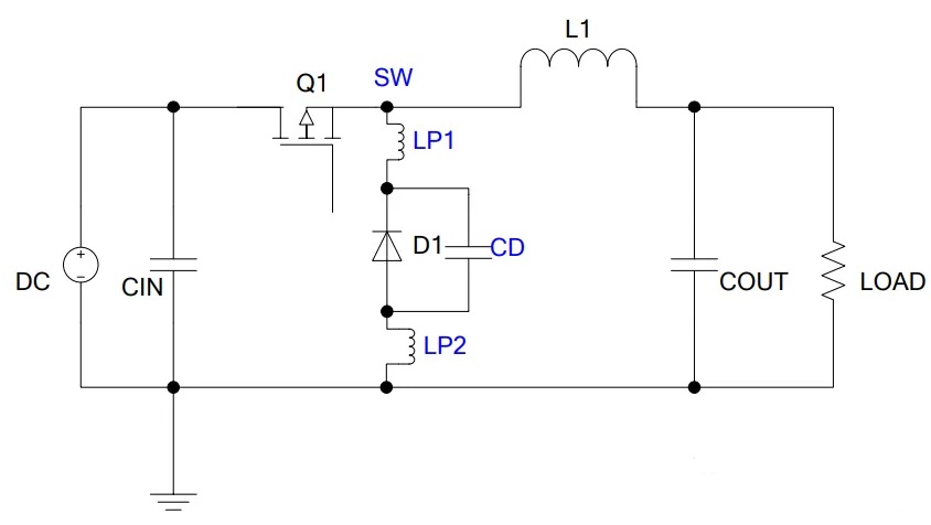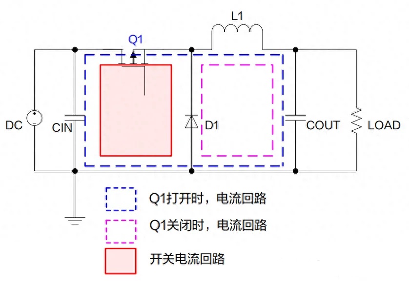 不論功率管 Q1 打開還是關斷,電流均流過 L1 和 COUT,表明流過 L1 和 COUT 處電流是連續電流, 流過 CIN、Q1、D1 的電流是開關電流,開關電流會在寄生電感上產生毛刺電壓,對外輻射電磁波。