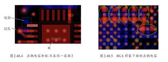 常見的 BGA封裝,其去耦電容通常放在 BGA下面,即背面。由于 BGA 封裝引腳密度大,因此去 耦電容一般放的不是很多,但應盡量多擺放一些,如圖2.48.5所示。