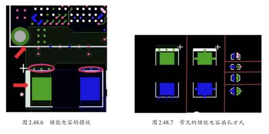 儲能電容的作用就是保證IC在用電時,能在最短的時間內提供電能。儲能電容的容值一般比較 大,對應的封裝也比較大。在PCB中,儲能電容可以離器件遠一些,但也不能太遠,如圖2.48.6所示。常見的儲能電容扇孔方式,如圖2.48.7所示。