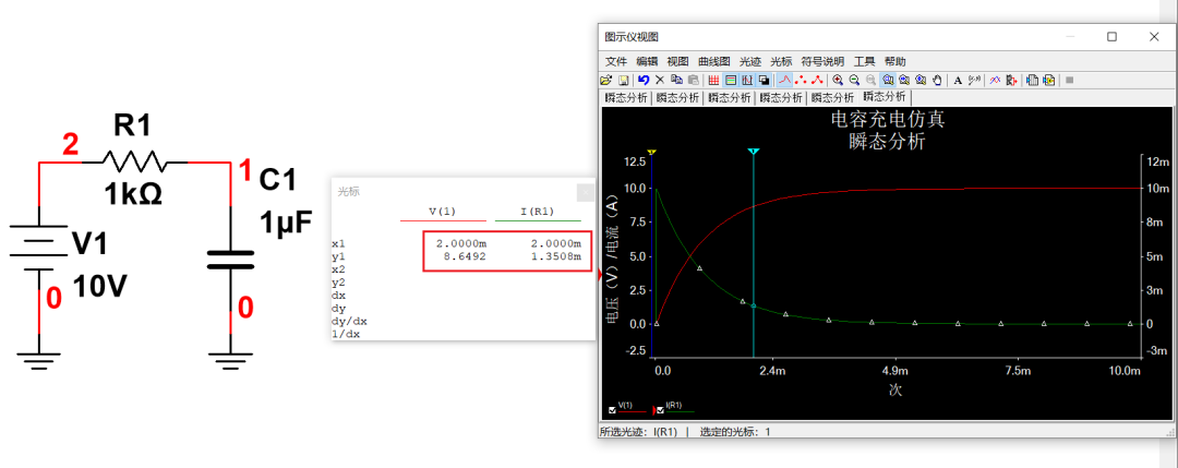1個時間常數1ms的時間,電容電壓充到63%,前半段電容的充電電流還是很大的,此時反推回去1τ下的充電電流為0.37*V1/R1。綠色的為電容的充電電流曲線,紅色的為電容的充電電壓曲線。