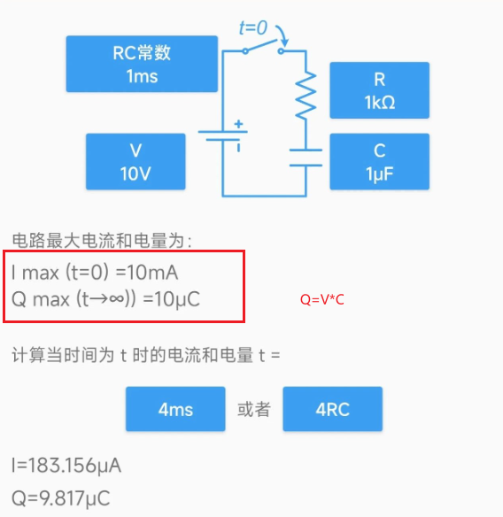 所以可以認為3個時間常數電容就基本充滿了(95%),而且在上電瞬間,電容等效為短路,此時電流最大,等效為V1/R1。隨著時間的增加,電容上的電壓越來越高,充電電流越來越小,t趨向于無窮的時候,電流趨向于0。下圖工具里的計算器也可以計算。