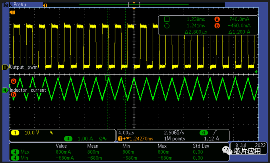綠色波形 為流過電感電流, 黃色波形 為音頻功放輸出PWM。