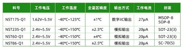 因此,在對長期性能有高可靠性要求的汽車電子系統中,全溫區內能提供準確溫度值的CMOS集成式溫度傳感器是十分優質的選擇,納芯微的車規級數字溫度傳感器優勢明顯,此次推出的車規級數字輸出溫度傳感器NST175-Q1以及車規級模擬輸出溫度傳感器NST235-Q1,NST86-Q1,NST60-Q1,均采用納芯微高性能、高可靠性CMOS測溫技術,具有全溫區高精度、高線性度、低功耗以及高集成度等特性,無需額外電路,可有效降低整體方案成本,是無源熱敏電阻的有效替代方案。