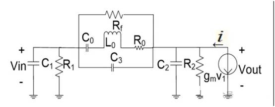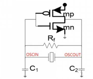 除了石英晶振外,mp、mn、Rf、C1、C2器件全部集成于芯片之中,考慮到OSCIN和OSCOUT引腳到地的等效電阻R1、R2,上圖的等效電路結構如下圖: