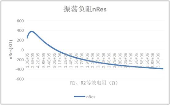 取T(s)函數(shù)的實部為nRes(稱為振蕩負阻),并將C0、 L0、R0、Rf、gm1、C1、C2合適的參數(shù)代入,并假設R1=R2,以R1、R2為變量,畫出R1、R2和nRes的關系圖如下: