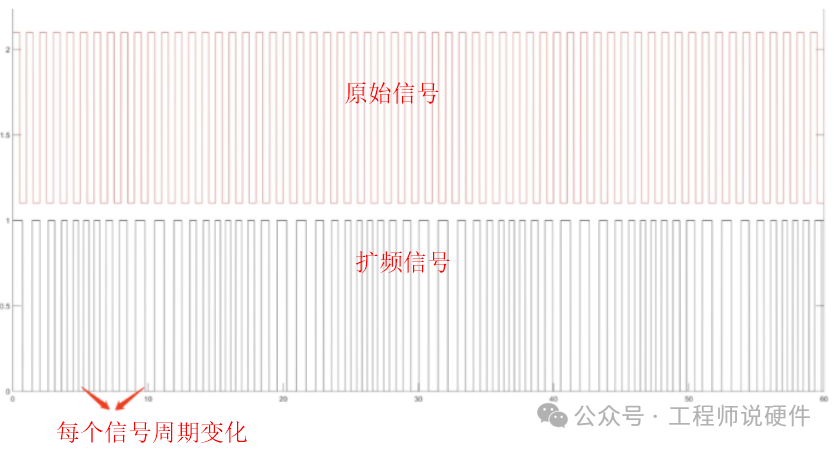 從時域角度來講,就是將原本單一時鐘周期的信號進行上下微調。比如先將每個時鐘周期以固定偏移量,進行逐步累加n個周期,然后再以同樣的偏移量,逐步減少n個周期。這樣能保證一段時間內,總的時鐘周期數是不變的,但是局部時鐘周期是一直在變化的。