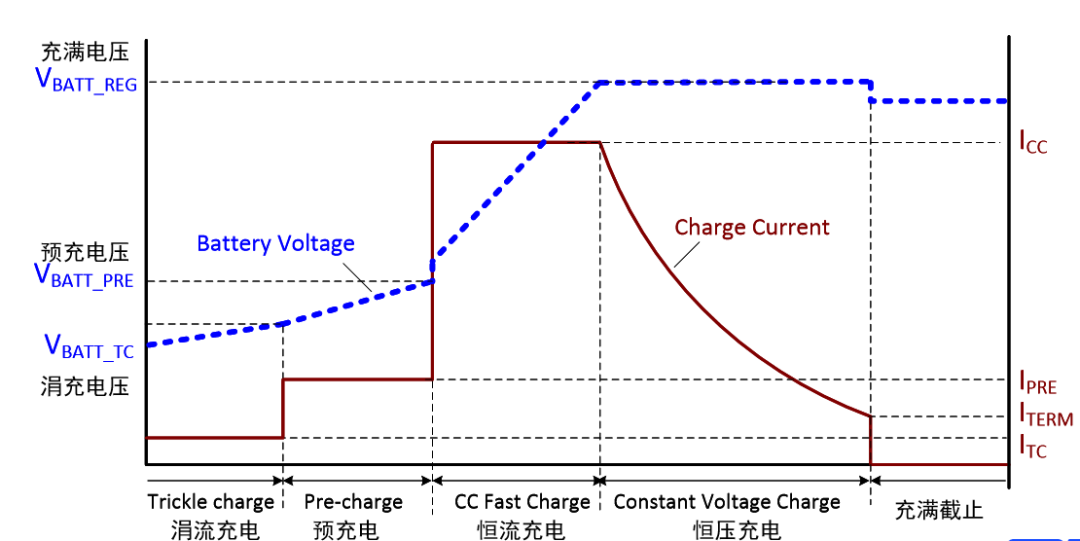 針對每個不同的階段,通過分別對應不同電壓的閾值來管理充電過程。