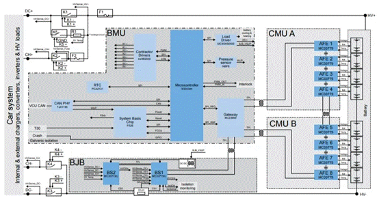 BMS由電池管理單元(BMU)、電池監(jiān)測單元(CMU)和電池接線盒(BJB)3個模塊組成,如何在作為系統(tǒng)大腦的BMU、CMU和BJB子系統(tǒng)之間建立BMS內(nèi)部通信也需要設(shè)計人員在選擇方案時做出仔細評估。
