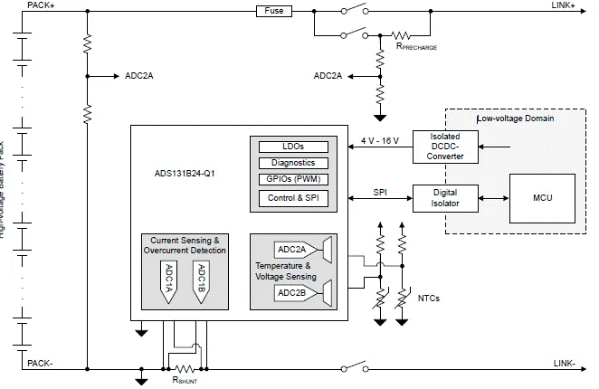 德州儀器(TI)ADS131B24-Q1是一款可用于電動汽車HVBMS的電壓、電流和溫度檢測的產(chǎn)品,有很高的集成度,包括:兩個同步采樣、高精度的24位ADC 通道(ADC1A、ADC1B),可使用外部分流電阻以高分辨率和高精度測量電池電流;兩個獨立的數(shù)字比較器,可與兩個ADC并聯(lián)來實現(xiàn)快速過流檢測;還集成了兩個多路復(fù)用的16位ADC通道(ADC2A、ADC2B),可使用外部高壓電阻分壓器來測量分流器溫度和系統(tǒng)中的其它電壓,例如電池組電壓。分流器溫度通過熱敏電阻或模擬輸出溫度傳感器等外部溫度傳感器進行測量。