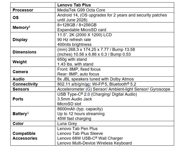 Lenovo™推出了Lenovo Tab Plus。這是一款娛樂平板電腦,配有8個JBL揚聲器,采用經Dolby Atmos®調諧的高保真矩陣結構,可提供卓越的聲學體驗。這款為音樂愛好者設計的11.5英寸平板電腦配備了2K顯示屏,帶來生動的視覺效果,對其優質音效形成完美補充,并且擁有可調節支架,可從各個角度帶來最佳享受。