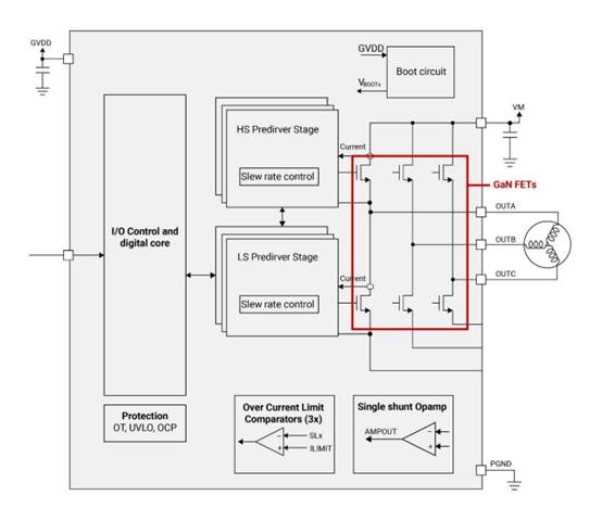 18V、3A三相無刷無感驅動、180˚正弦,集成驅動算法+預驅+MOS |