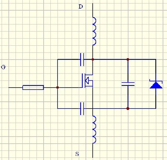 一般認為MOSFET(MOS管)是電壓驅動的,不需要驅動電流。然而,在MOS管的G極和S極之間有結電容存在,這個電容會讓驅動MOS變的不那么簡單。下圖的3個電容為MOS管的結電容,電感為電路走線的寄生電感: