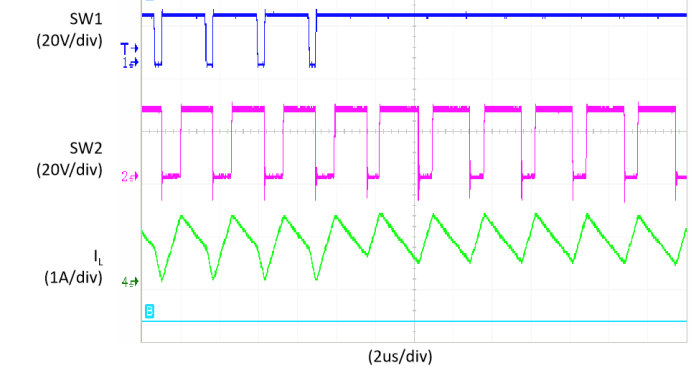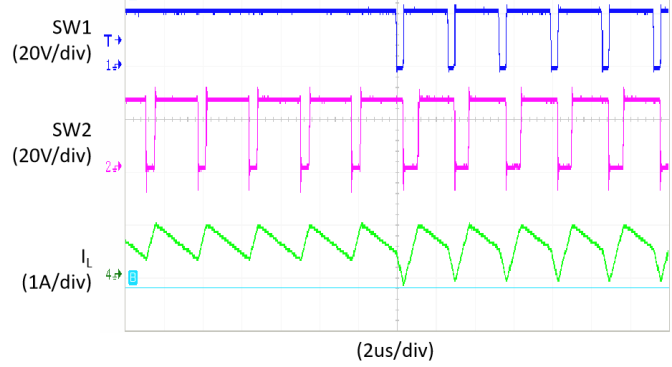 圖為由升壓模式過渡到升降壓模式,輸入端開關節點由直通變為開關,顯示節點開關波形和電感電流波形變化。