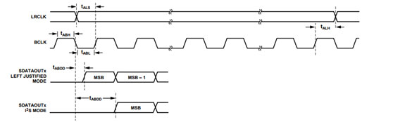 • MCLK:主時鐘。嚴格意義上, MCLK 不歸屬于這個協議范圍之內,因為器件的啟動都需要主時鐘的輸入,同時我們的 BCLK 基本上是從 MCLK 分頻或者倍頻而得到的,所以在常見的不帶晶振的 AD、DA 芯片中,需要這么一個輸入。例如 ADI 的 ADAU197X 系列,如果有的器件不需要 MCLKIN,那么一般是以 BCLK 作為了時鐘的主導。