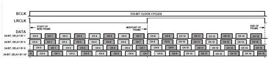 另外,它的對齊方式和電平方式也和 IIS 的類似。下圖(圖2)為某芯片的 TDM16 的協議: