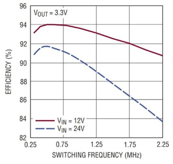 降壓開關穩壓器的效率與頻率的關系圖。該圖取自Linear Tech/Analog Devices的 LT8610 數據表。