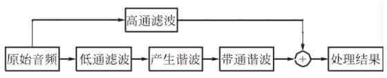 心理聲學(xué)實驗中,存在一種“虛擬音調(diào)”的實驗現(xiàn)象:人耳在基頻缺失的情況下利用諧波組合重建信號音調(diào)高低。主要流程如下圖,產(chǎn)生諧波主要方法為MaxxBass算法和VB Phase Vocoder。