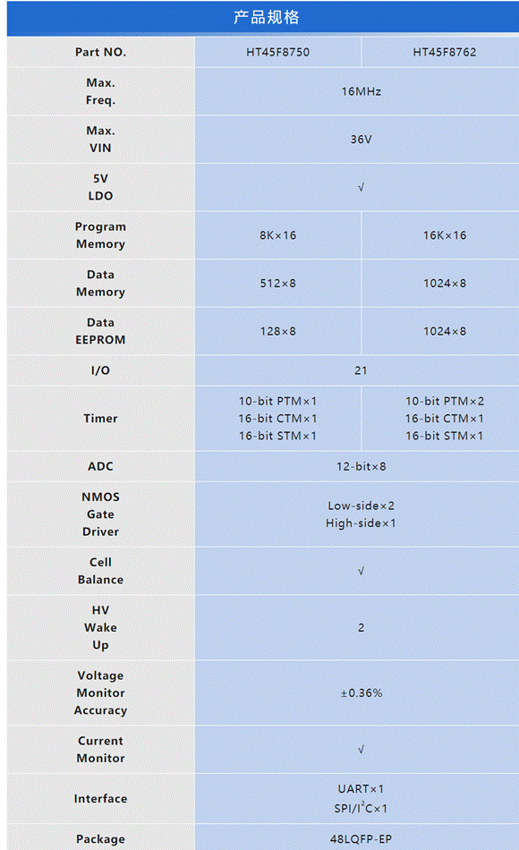 HT45F8750/HT45F8762系列具備8K×16/16K×16 Flash ROM、512×8/1024×8 RAM、128×8/1024×8 EEPROM,在I/O方面具有21個多功能腳位,包括多通道12-bit A/D轉換器、比較器等。SPI、I²C和UART通信接口搭配內建IAP功能實現在線更新程序,整合2組Low-side高壓Gate-driver、1組High-side高壓Gate-driver用于驅動MOSFET。內建待機零功耗與2組高壓喚醒電路,整機耗電流可低至0.1µA,增加電池待機時間,并于充電器接入或按鍵按下時喚醒MCU。內建被動均衡電路與過溫保護,大幅減少零件數量并縮減PCB空間。