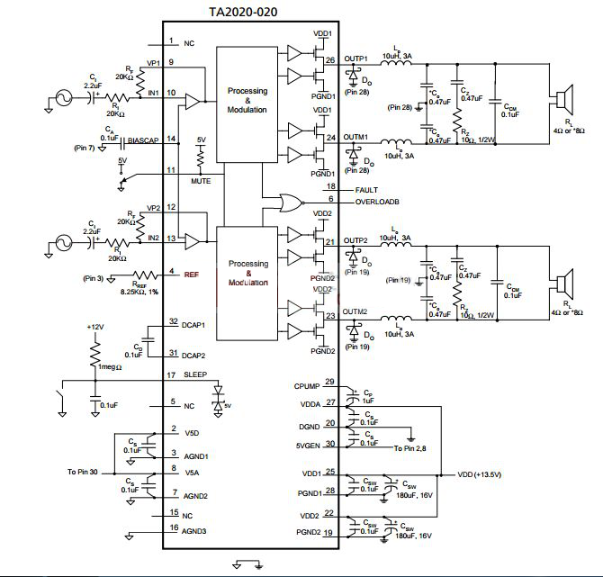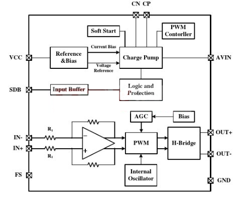 上圖是TA2020的內部模塊構造,從上圖上可以看出,該芯片內部主要集中了處理和調制模塊,從而實現高品質音頻的特性。