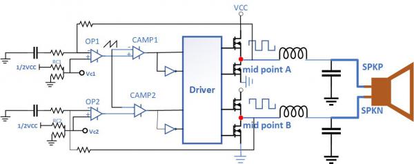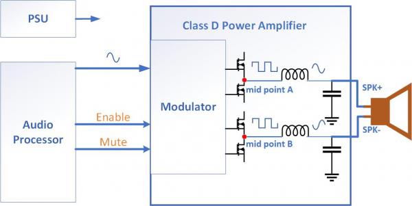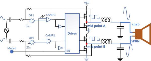 Class D功率放大器輸出與輸入音頻信號相對應的脈沖,A點和B點的脈沖由半橋開關產生。低通濾波器由電感和電容組成,為從這些高頻脈沖中解調出的音頻信號提供路徑,解調后的音頻信號通過揚聲器,將電能轉換為聲能,然后被人的耳朵聽到。如果用戶在開始播放音樂或計劃停止音樂時總是聽到爆裂聲或點擊聲,這將是非常糟糕的體驗。