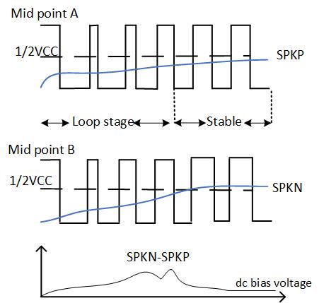 因此,揚聲器端子SPKP和SPKN之間的電壓水平相同,沒有電壓偏差導致電流流入揚聲器的線圈,當然也不會有點擊或爆裂噪聲。現在我們來看實際的模擬電路:元件的公差、參考點的位置不同、驅動器的時間方案差異、PCB走線因素等。所有這些差異導致A點的PWM與B點的PWM不匹配,即使在相同的初始條件下啟動也是如此。圖4是功率放大器從靜音到取消靜音時的實際波形。調制器開始工作并將占空比從小調節到50%,這是功率放大器在啟動階段的循環階段,PWM的目標是在功率放大器環路穩定后保持輸出平均水平等于1/2VCC。