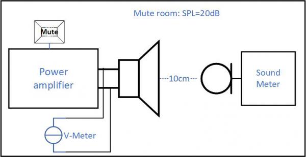 Figure 7 該平臺用于爆裂噪聲評估,V-Meter可以測量直流偏置電壓,Sound meter可以測量來自揚聲器的爆裂噪聲的聲壓。靜音按鈕用于將功率放大器從靜音切換到取消靜音或從取消靜音切換到靜音,Sound meter的麥克風傳感器與揚聲器在同一條線上,Sound meter將測量揚聲器的聲壓級。該平臺設置在靜音室中,然后分別進行有預補償和無預補償的測試,數據列在以下表格中。