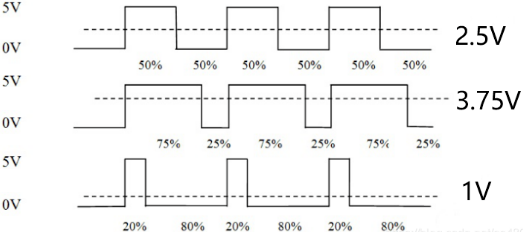 也就是說,在一定的頻率下,通過不同的占空比即可得到不同大小的輸出模擬電壓,PWM就是通過這種原理實現數字模擬信號轉換的。