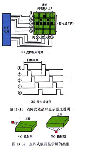 點陣式液晶顯示屏有反射型和透射型之分,如圖13-32所示,反射型LCD屏依靠液晶不透明來反射光線顯示圖形,如電子表顯示屏、數字萬用表的顯示屏等都是利用液晶不透明(通常為黑色)來顯示數字,透射型LCD屏依靠光線透過透明的液晶來顯示圖像,如手機顯示屏、液晶電視顯示屏等都是采用透射方式來顯示圖像的。