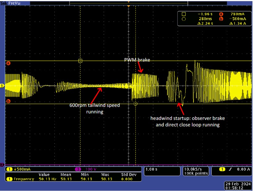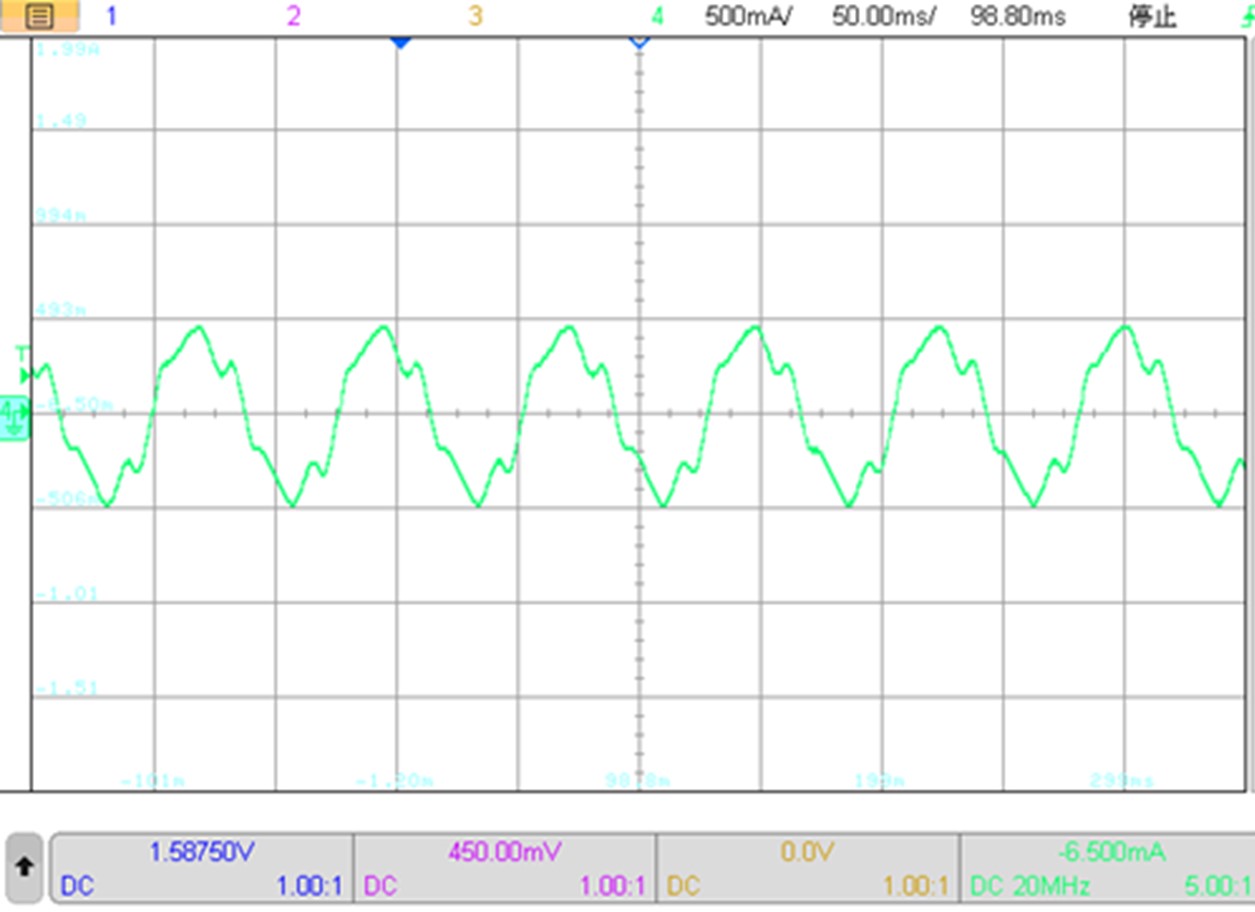 該方案采用載波頻率16KHz,支持速度、電流閉環控制,弱磁控制模式。非靜止啟動功能使吊扇即使在最初因外力而反向轉動時也能正常旋轉。方案還集成了多種保護,如硬件和軟件過流保護、過壓和欠壓保護,以及缺相和堵轉檢測。發生故障后,一旦故障被清除,系統將嘗試重新啟動并恢復到上一個速度狀態。算法響應速度快,參數配置簡單,可直接閉環啟動。圖2為該方案的連接圖。圖3為正常運行的相電流波形圖。圖4為逆風啟動的相電流波形。