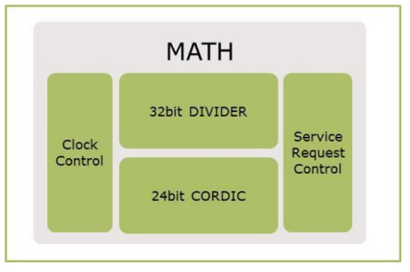XMC1302中集成一個MATH協處理器,它完全獨立于CPU,工作在PCLK64MHz)時鐘下。MATH協處理包含了一個32位的DIVIDER和一個24位的CORDIC。DIVIDER單元實現32bit有符號/無符號除法。CORDIC單元實現24bit三角函數運算。DIVIDERCORDIC單元可并行工作,該模塊減輕了CPU的負荷,對于實現無感FOC控制算法提供了良好的支持。